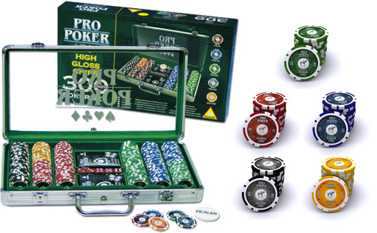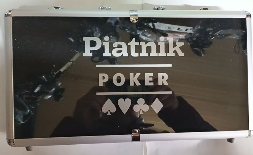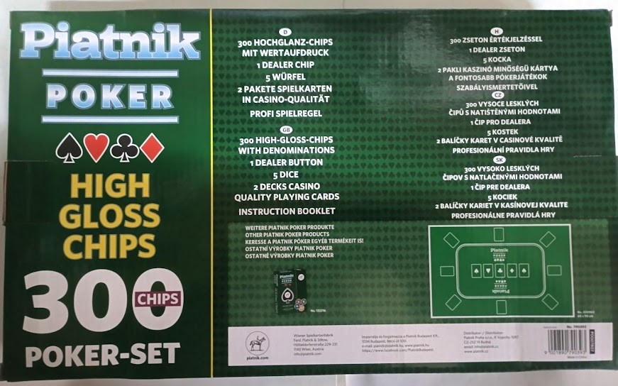 • 300 покер чипа в пет цвята с номинали ,като на чиповете е изобразено логото на една от най-реномираните фирми за развлекателни игри: Piatnik Co.