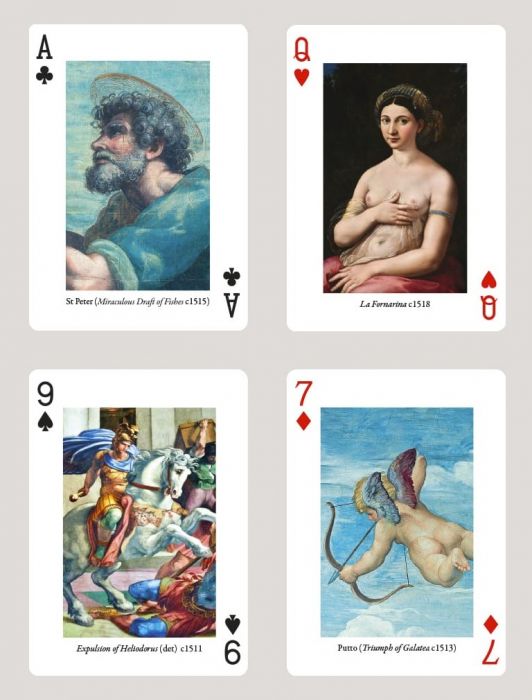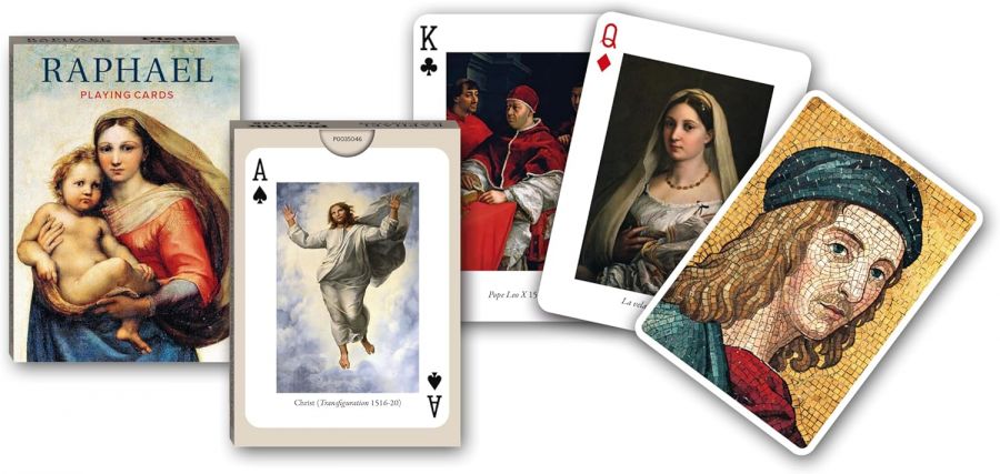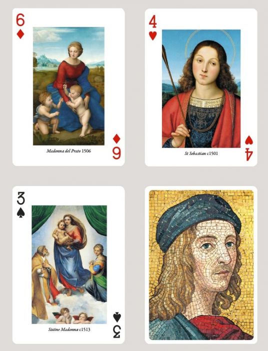# Карти за игра с мотиви от световноизвестния художник Рафаел Художника придобива слава заради хармоничните и балансирани композиции и прекрасните си картини с Мадона. В допълнение към кариерата си на художник във Флоренция и в папския двор на Рим, той става и строителен ръководител на базиликата „Свети Петър“ и надзорник на римските антики.